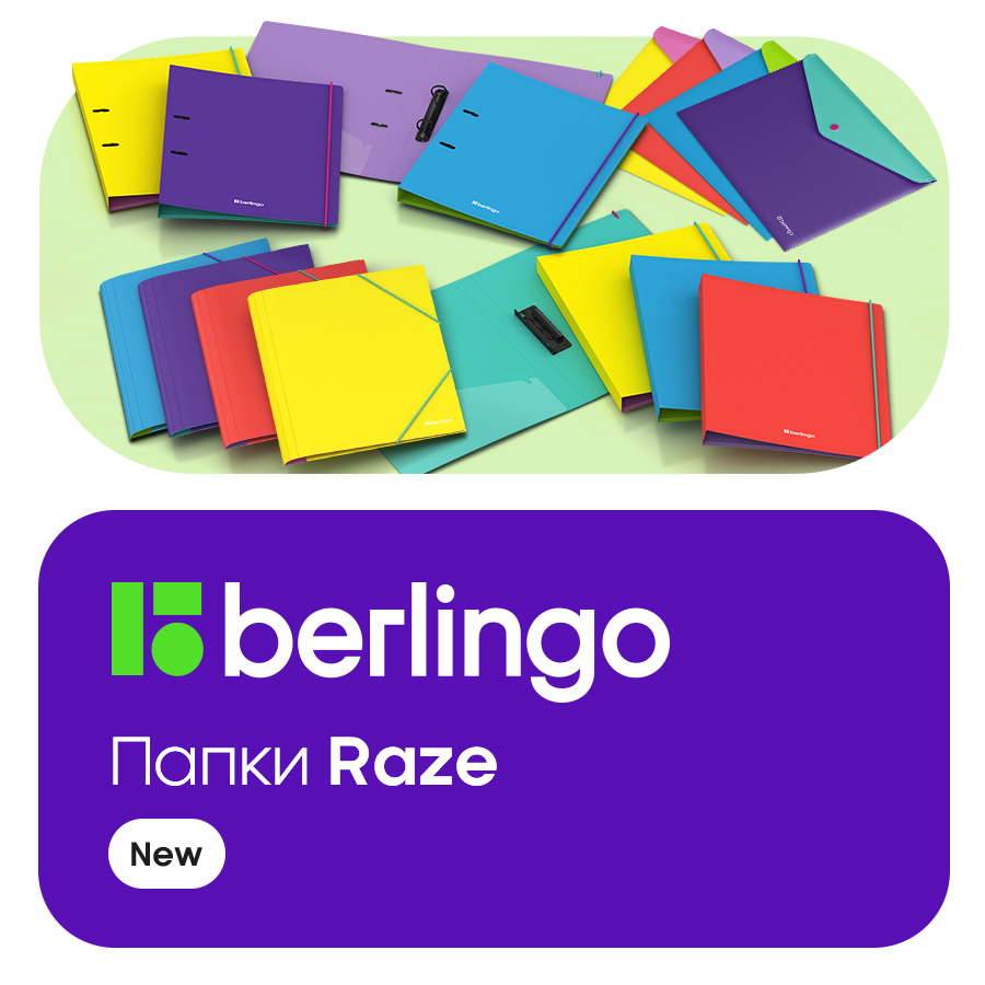 Berlingo представляет новую суперяркую серию папок Raze. Дизайн новинок — контрастное сочетание трёх цветов. Выберите свою папку — ту, что отражает ваше настроение и индивидуальность.